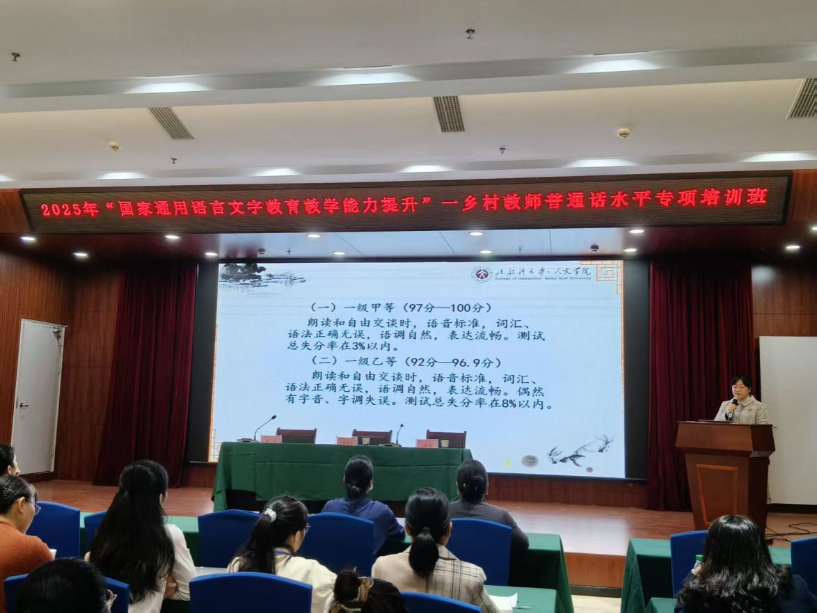 本次培训由我院侯艳、何洁芳、左凌姣、黄菲四位普通话水平测试员担任主讲教师。他们针对乡村教师常见的平翘舌音不分、前后鼻韵母混淆、儿化音缺失等问题,围绕声韵调规范、语流音变、轻声儿化、短文朗读、命题说话等内容,开展系统讲解、示范朗读与个别指导,通过实时纠错与强化训练,切实提升教师们的语音标准程度与普通话教学语言运用能力。