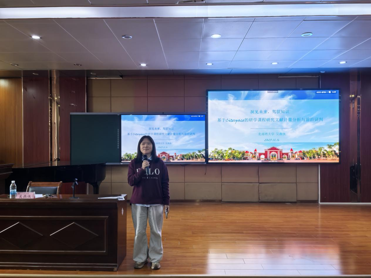 为进一步拓宽学院学生学术视野、提升专业认知,扎实推进学院人才培养工作部署,12月16日15:00,北部湾大学人文学院教师吴燕侠博士以“洞见未来,驾驭知识——基于Citespace的研学课程研究文献计量分析与前沿研判”为题,为全院师生带来一场兼具理论深度与实践价值的学术讲座。本次讲座由刘云春教授主持,作为学院各教研室每学期常规学术工作的重要组成,讲座通过“理论讲解+实操演示+互动交流”相结合的形式,系统讲授文献计量分析方法与科研工具应用技巧,内容务实、指导性强,有效助力师生提升学术研究能力。