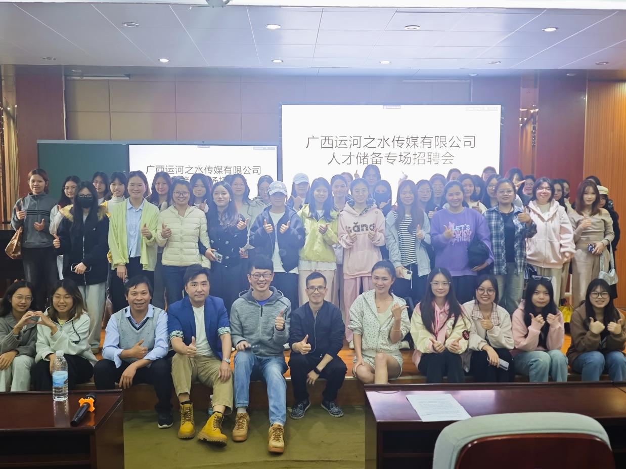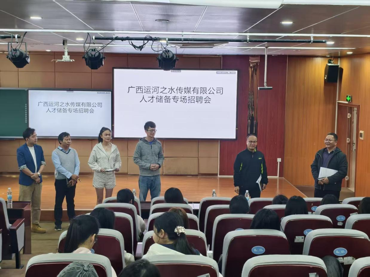 3月10日下午,广西运河之水传媒有限公司在2A-208报告厅举行人才储备专场招聘会。公司高层管理团队亲临现场,面向新闻学专业学生详细介绍了公司概况、电商行业前景及人才需求,吸引了众多学子关注。