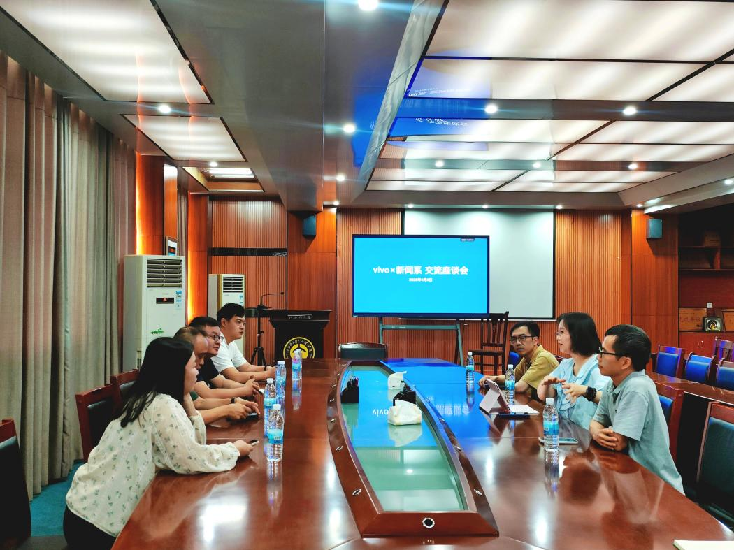 vivo公司钦北防区总经理梁振伟介绍了企业在手机影像、品牌推广等方面的有关情况。他表示,企业愿充分发挥自身在技术、设备和资源等方面的优势,围绕影像技术支持、专业讲师共享、实践教学协同等内容加强与新闻系的交流合作,为学生专业学习和实践训练提供支持,助力人才培养与教学创新。