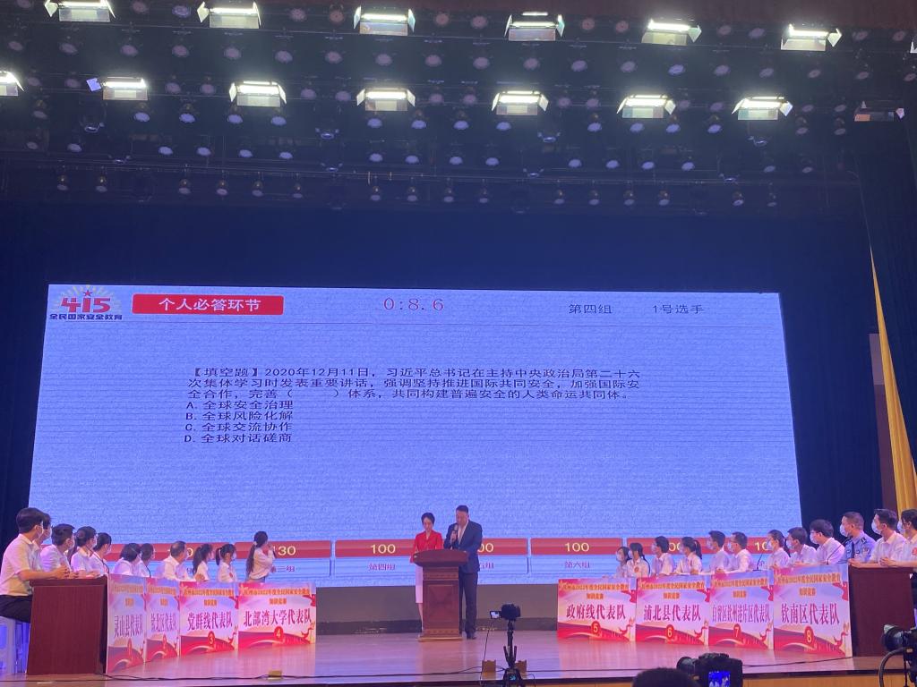 此次竞赛共有灵山县、浦北县、钦南区、钦北区和自贸区钦州港片区、北部湾大学、党群组织、政府办八支队伍,共四轮比赛。各队在竞赛前两轮中不分胜负,至第三轮抢答赛积分差距逐渐拉大,局势高潮迭起。在决赛环节,我校代表队的选手们临危不乱,大胆选择60分的风险题拉近比赛差距,最终获得290积分,成功斩获钦州市2022年度全民国家安全教育知识竞赛三等奖。