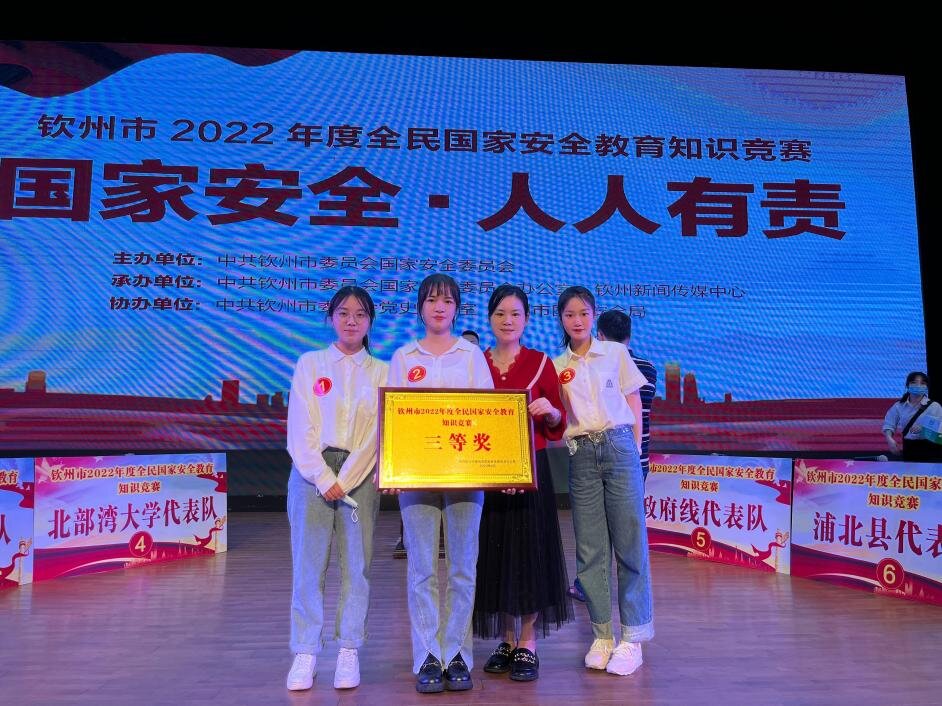 4月15日下午,由钦州市委国安委组织开展的“钦州市2022年度全民国家安全宣传教育知识竞赛活动”在钦州市老年大学多功能厅举办,由我院蒙桂秀老师指导、汉教本191陈竹玉、汉教本201龙嘉怡、中文本201陈俞蓉、中文本庞丹等四名同学组成的北部湾大学一队以优异成绩获三等奖。