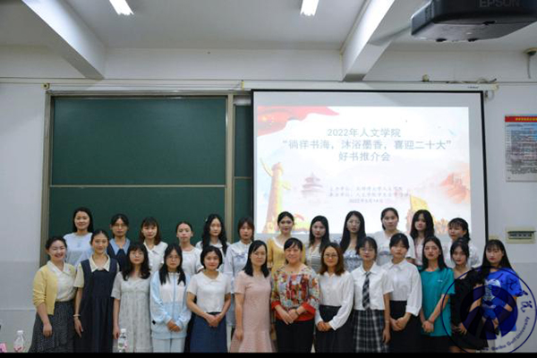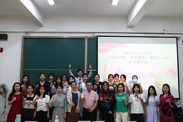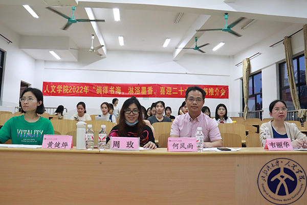 5月14日晚,我院在11号教学楼412、413教室举行以“徜徉书海,沐浴墨香,喜迎二十大”为主题的好书推介会,人文学院副院长侯艳、党委副书记何风雨、学工办副主任兼团委副书记蒙桂秀,及各中文系教师、专职辅导员作为评委出席现场,来自人文学院各个专业的47名同学参加本次活动。