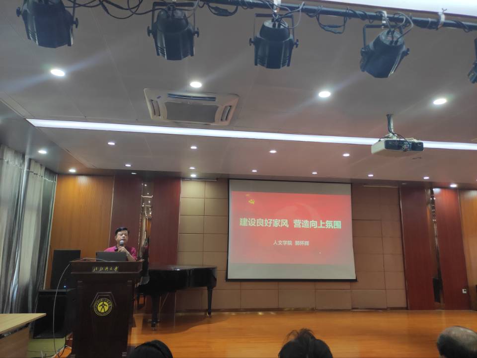 随后,郭书记讲话,首先针对就业问题再次强调,呼吁所有教师认真对待,要关注最新文件等就业信息,持续紧跟就业工作。接着,郭书记以“建设良好家风 营造向上氛围”为主题对全体教职工进行了专题培训。专题培训通过观看相关视频,并以习近平总书记关于家风建设的重要论述引入,从“微观--小家庭”和“中观--大家庭”两个维度,结合自身经历为老师们详细讲解“建立什么样的家风”、“如何建立优良家风”等问题。关于加强师德师风建设、廉洁从教,郭书记特别强调了“八要”和“八不”要求。通过这次培训,老师们深刻认识到加强家风建设的重要性,并表示在今后的工作中,时刻牢记“八要”和“八不”要求,内化于心,外化于行。