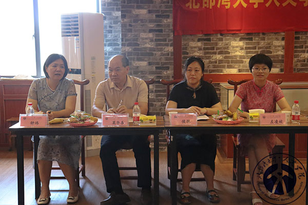 茶艺大赛评委(从左到右分别为高级茶艺师、评茶员钟玮老师,人文学院院长莫华善老师,副院长、高级评茶员侯艳老师,中华才艺坊指导教师左凌姣老师)
