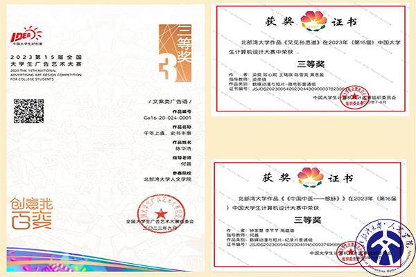 钟家慧、李芊芊、周璐璐(2020级)创作的纪录片《中国中医——根脉》和梁爽、陈心妮、王珺祺、陈雪英、黄思盈(2021级)创作的微电影《又见孙思邈》,获得中国大学生计算机设计大赛三等奖。2021级的陈华浩创作的文案类广告语获得全国大学生广告艺术大赛(大广赛)三等奖。据悉,这不仅是人文学院在“大广赛”中收获的第一个国家级奖项,也是今年北部湾大学在此项赛事中获得的最好成绩。