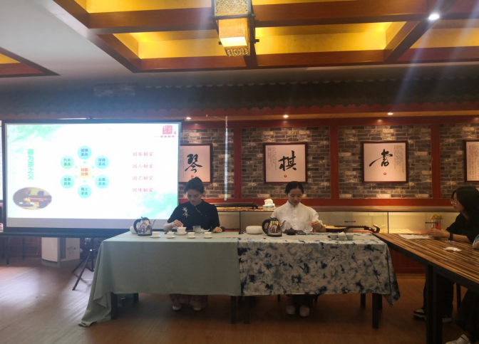 在随后的茶艺展示环节,由芳君默茶工作室的两名茶艺师演示了茶叶冲泡的方法,刘芳老师则在旁对茶艺老师演示的选茶、择水、温壶、投茶、冲泡到出汤的每一个步骤都进行了详细的解说,还重点讲述了区分茶的时间长短、种类等知识。
