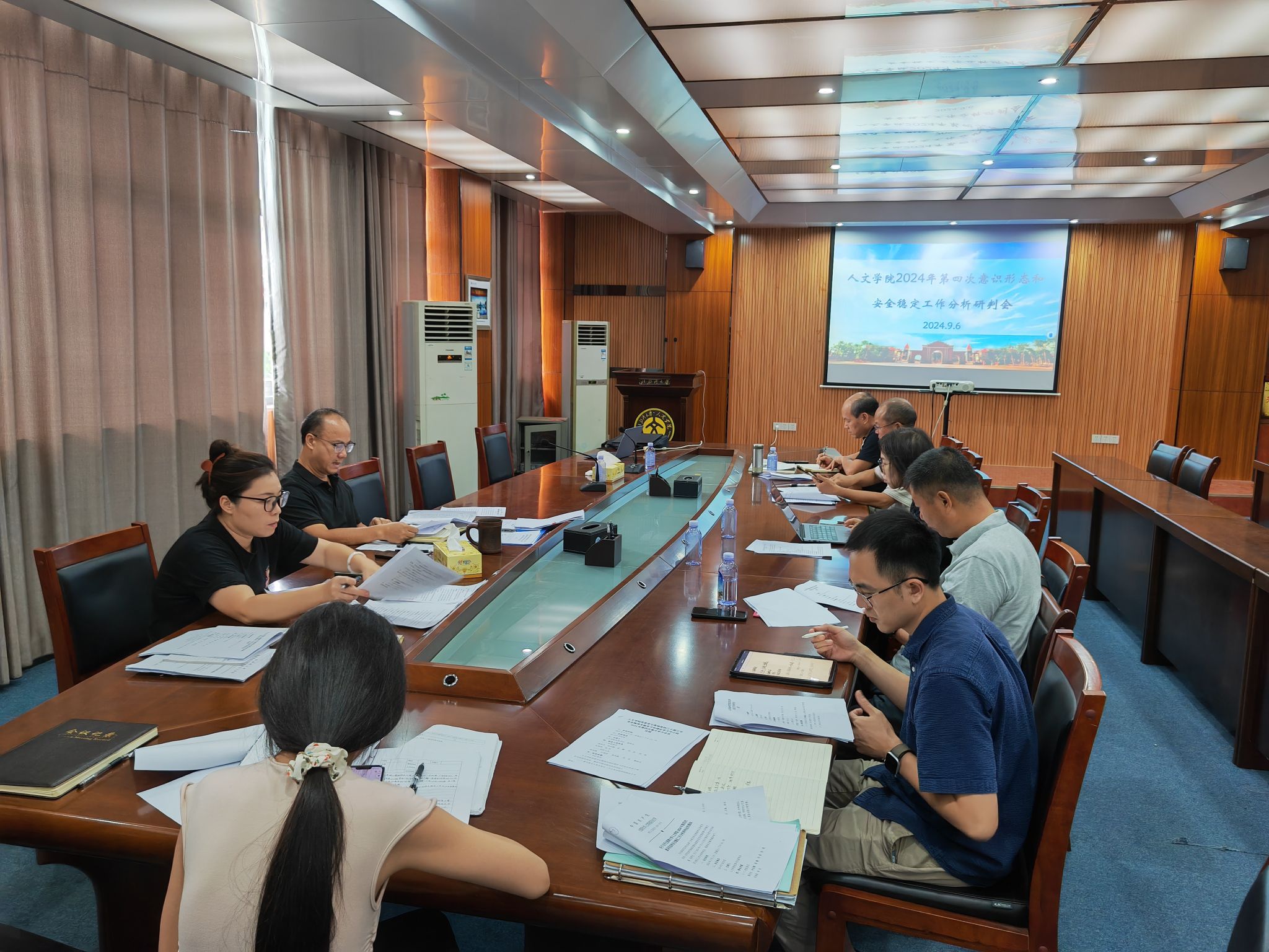 9月6日下午16:00,人文学院在2A-423会议室召开第四次意识形态和安全稳定工作分析研判会。学院党政班子和党委理论学习中心组成员参加会议,会议由学院党委书记梁伟杰主持。