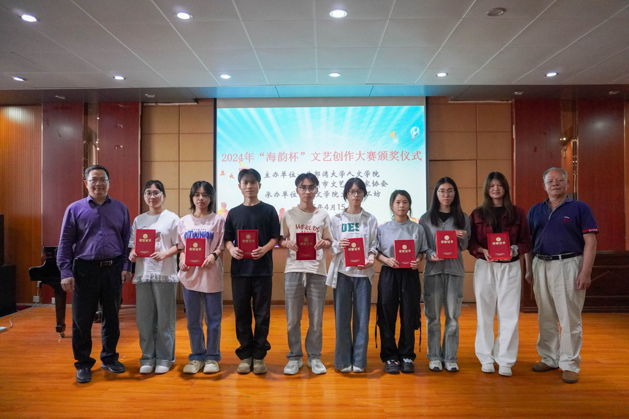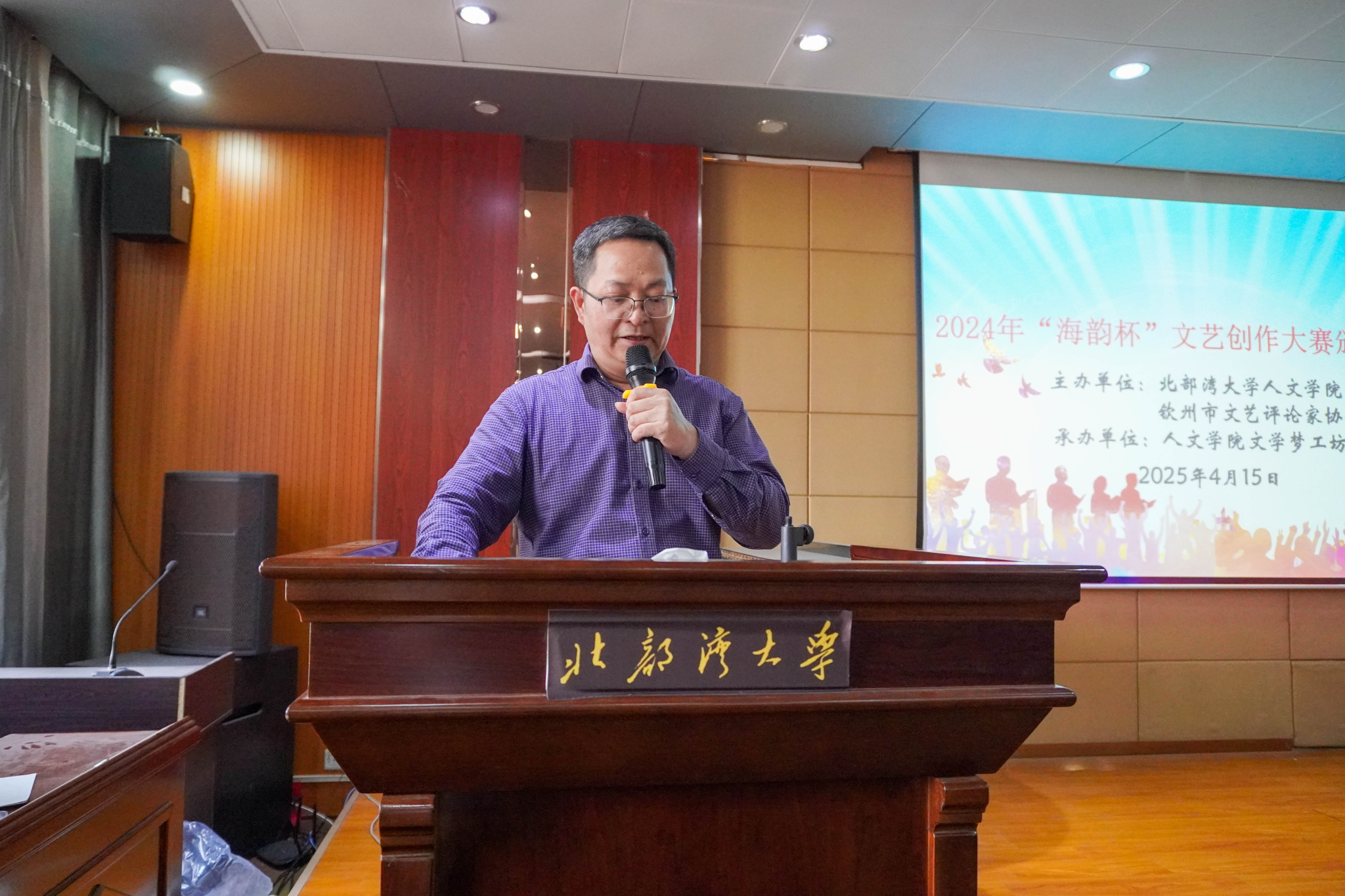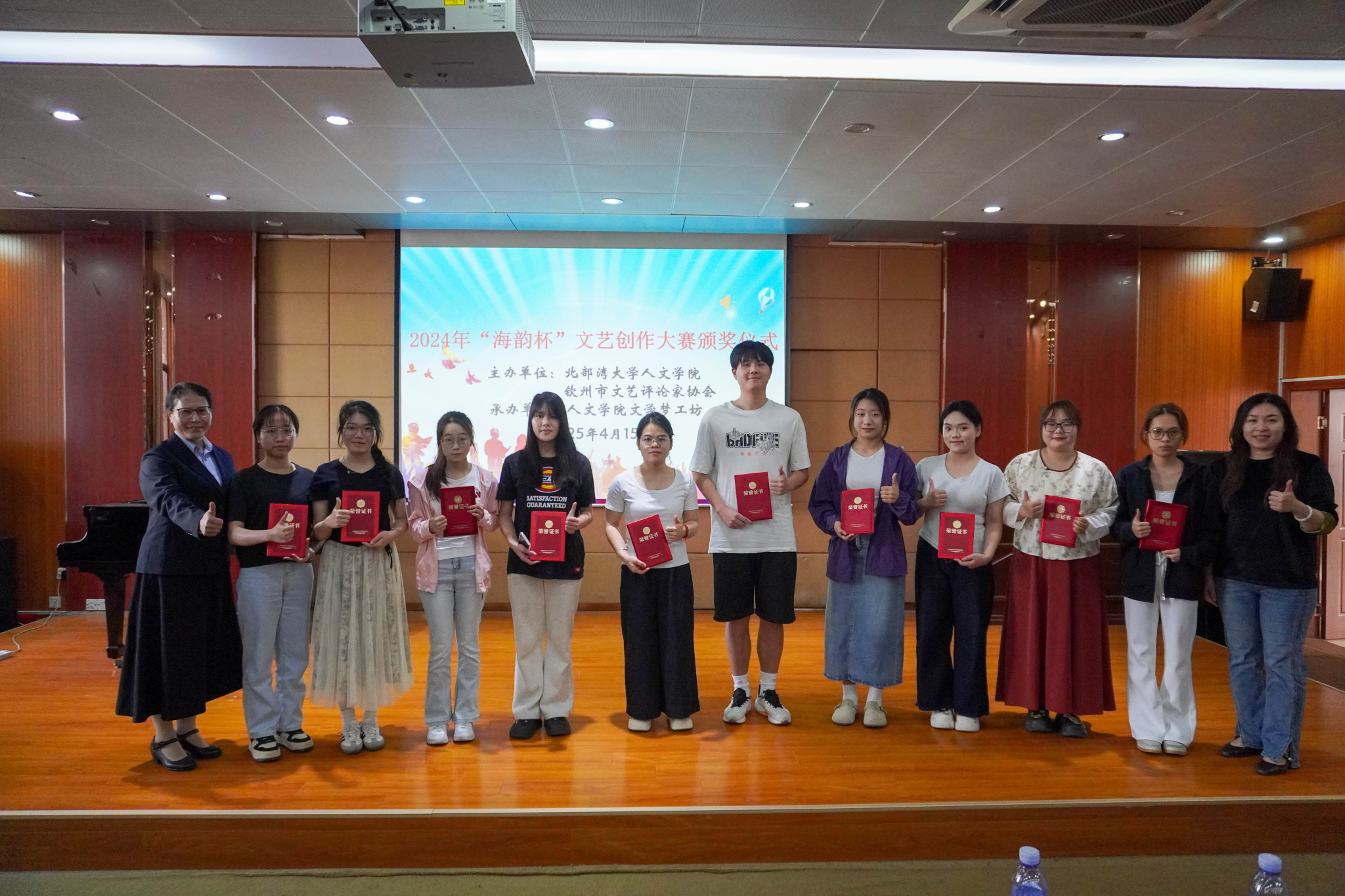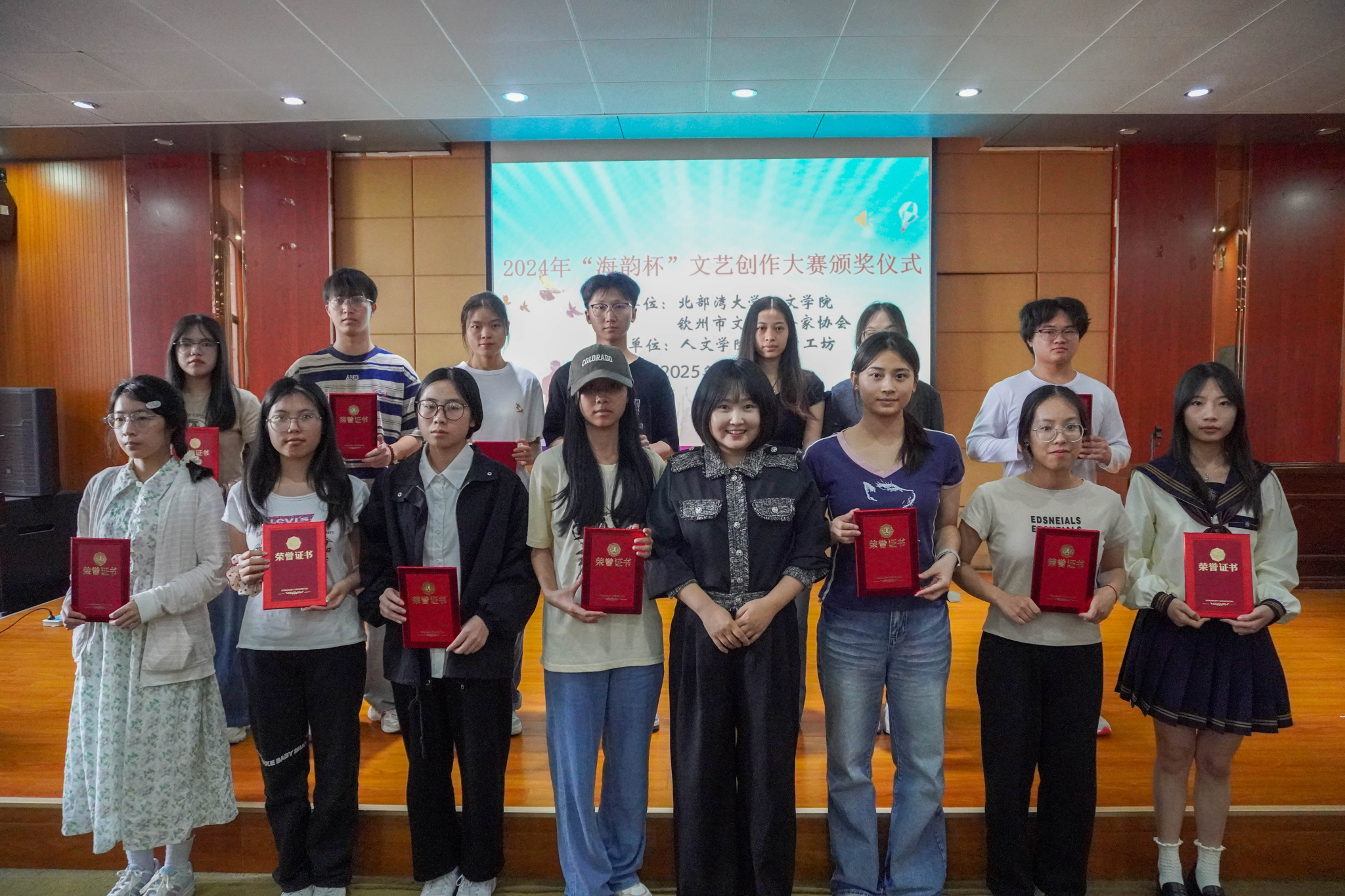 2025年4月15日下午,北部湾大学人文学院2024年"海韵杯"文艺创作大赛颁奖仪式于二号教学楼2A-208报告厅隆重举行。人文学院院长钟其鹏、钦州市文艺评论家协会主席何波、人文学院党委副书记曾曦出席典礼,评委代表何洁芳、徐巧两位教师与获奖学生代表、师生代表共计60余人共同参与活动。