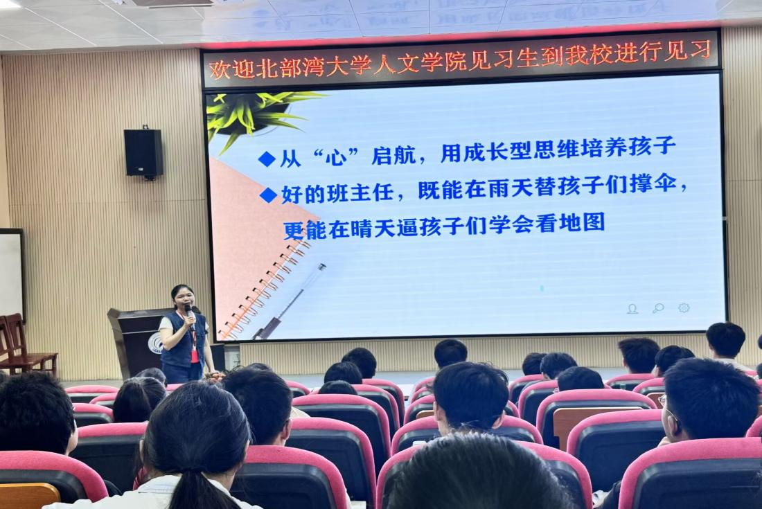 9月22日上午,钦州市外国语学校为见习师生举行了温馨的见面欢迎会。语文教研组组长何丽妮老师勉励同学们“在实践中体悟教育真谛,在体验中积蓄成长力量”。副组长易海清老师就见习安排作了详细说明。当日下午,八年级班主任阙嘉莹老师展示了一堂形式生动、内涵深刻的主题班会课;德育处黄玲主任与安稳办黄贵勇主任则分别围绕班级管理实务作了专题讲座,让同学们对班主任工作的内涵与方法有了更深的理解。