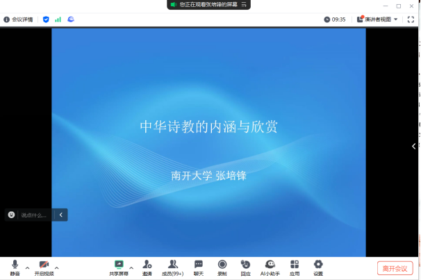 2024年11月11日晚7点,南开大学张培锋教授通过腾讯会议平台,为我院学生带来了一场题为“中华诗教的内涵与欣赏”的精彩讲座。讲座由人文学院副院长侯艳教授主持。