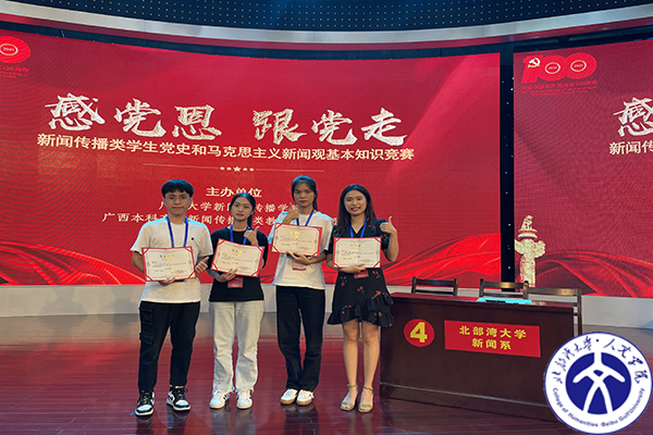 6月20日,我院新闻系参加由广西大学和广西本科高校新闻与传播类教学指导委员会共同主办的首次新闻传播类学生“感党恩,跟党走”党史和马克思主义新闻观基础知识竞赛。我校代表队由刘源老师带队,由王胜、秦秀姣、关丽君三名本科生组成参赛队伍,该队伍经过初赛、复赛的激烈角逐,顺利冲进决赛,并且以出色的表现荣获三等奖。
