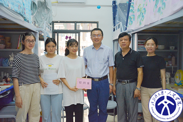 6月25日下午,我校校党委常委、副校长陈磊,人文学院党委书记郭怀辉,校党委宣传部精神文明科科长龙菊芳和辅导员黄健烨一行四人,走访东六栋308宿舍慰问中文专升本202班困难学生党员罗英,为她送去党的关怀和浓浓的节日祝福。