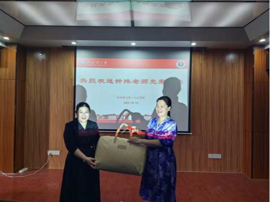 仪式伊始,钟其鹏院长简要介绍了钟玮老师的从教经历,肯定了钟玮老师在其教学生涯中所取得的成绩,并代表学院对钟玮老师为学校人才培养和学院事业发展所做出的贡献表示衷心感谢,希望钟玮老师在未来的生活中享受更好的人生时光,同时号召年轻教师要传承人文学院的优良传统,发扬兢兢业业的工作态度和严谨求实的工作作风,在教学科研岗位上做出更多更大的贡献。