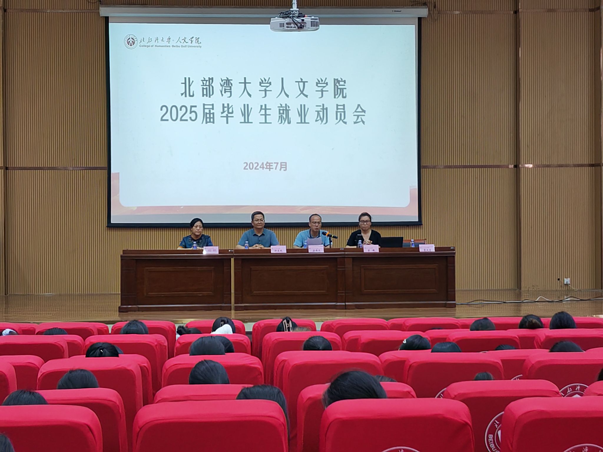 2024年7月10日下午14点30分,人文学院2025届毕业生就业工作动员会在学校4-101报告厅举行。人文学院党委书记梁伟杰,院长钟其鹏,党委副书记曾曦,副院长侯艳,辅导员黎政良及我院2025届毕业生参加了会议,会议由副书记曾曦主持。会上,首先由钟其鹏院长对2025届毕业生的就业形势作出说明。钟其鹏院长从积极拥抱就业,开启人生新篇章;密切关注就业形势,把握时代脉搏;努力提升就业技能,打造核心竞争力三个方面鼓励毕业生大胆尝试就业,迎接新的人生。