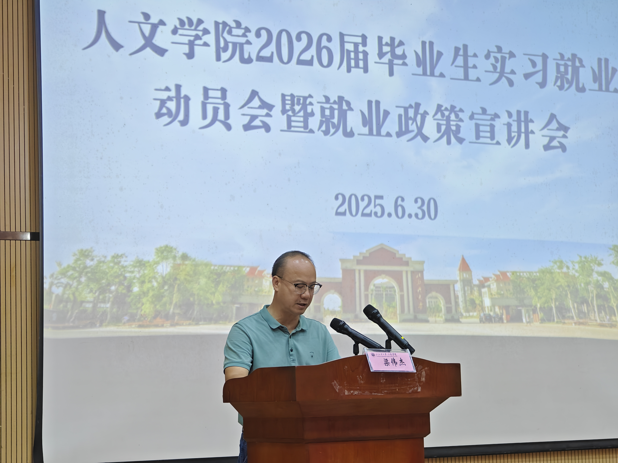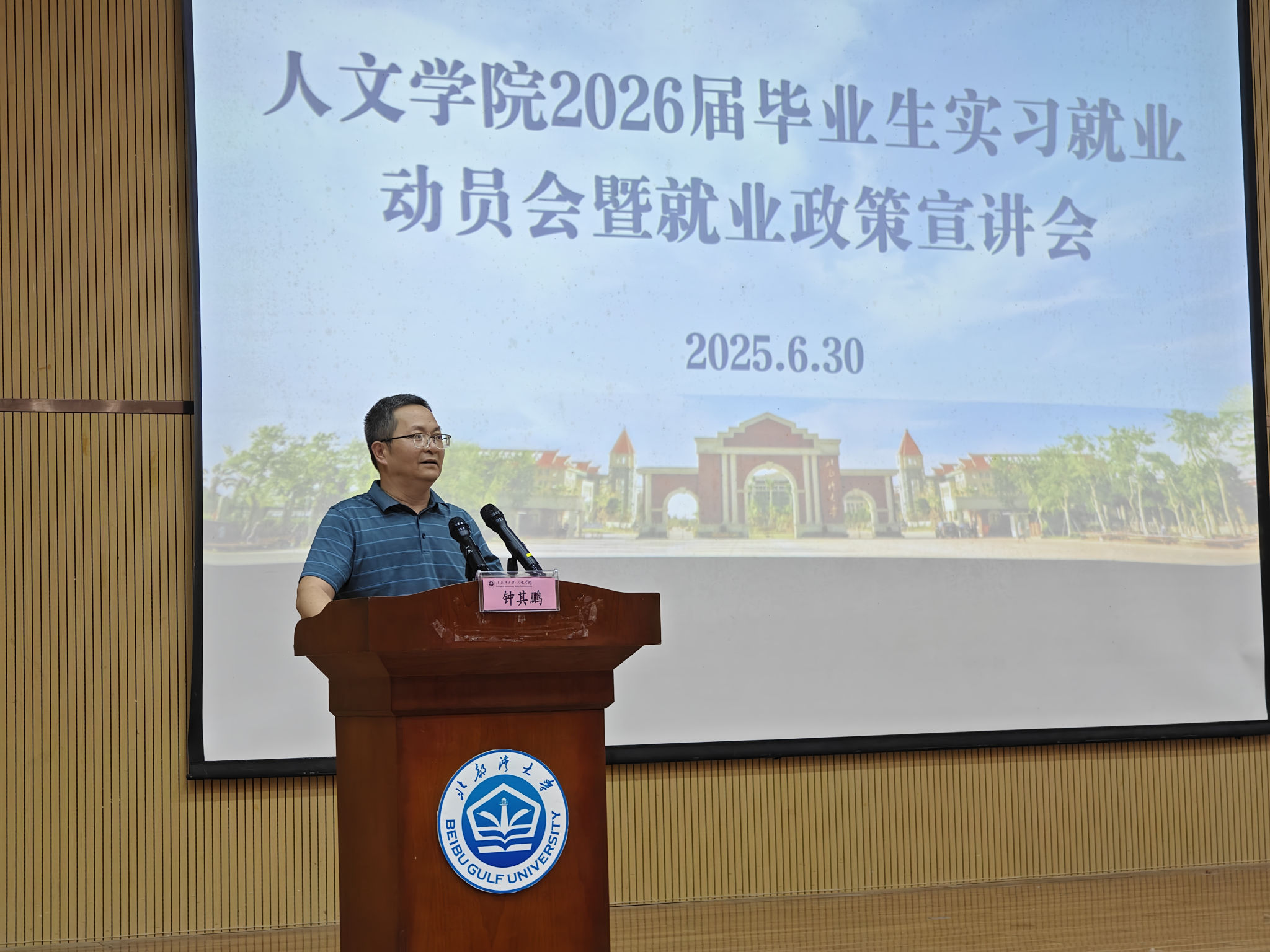 2025年6月30日下午,北部湾大学人文学院2026届毕业生实习就业动员会暨就业政策宣讲会在4号教学楼报告厅举行。人文学院党委书记梁伟杰、院长钟其鹏,党委副书记曾曦、学工办主任(团委书记)彭仁芝及辅导员石艳萍、苏菲、黎政良老师出席了本次会议。