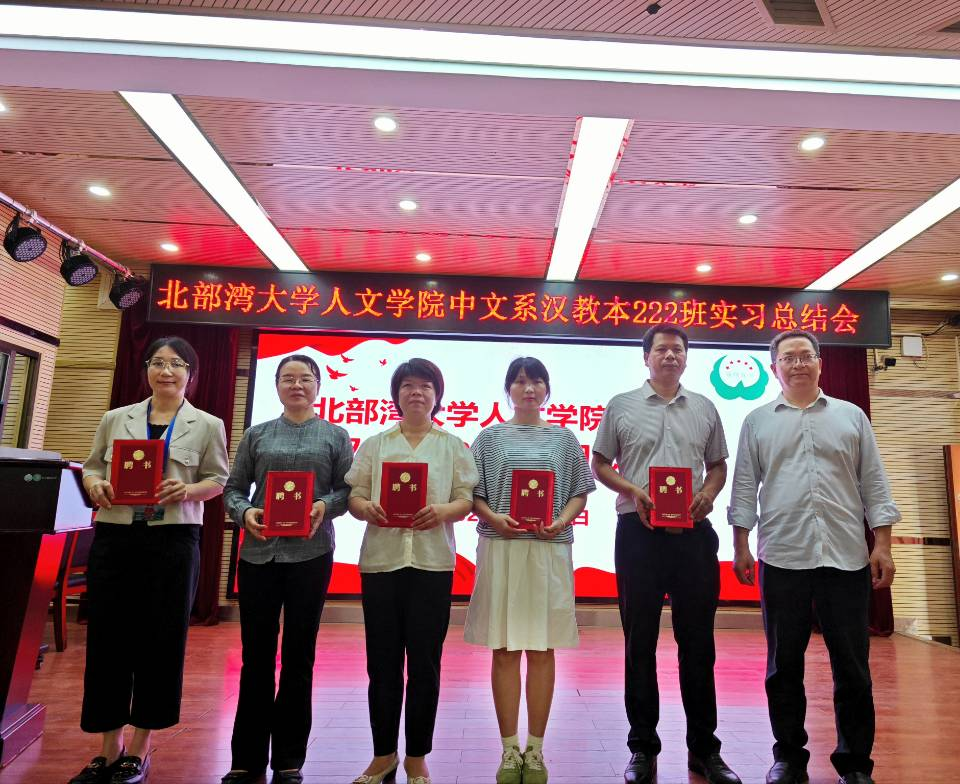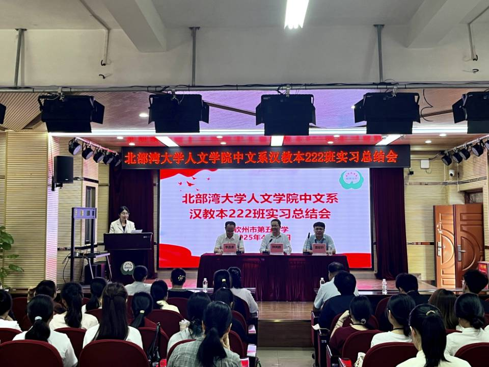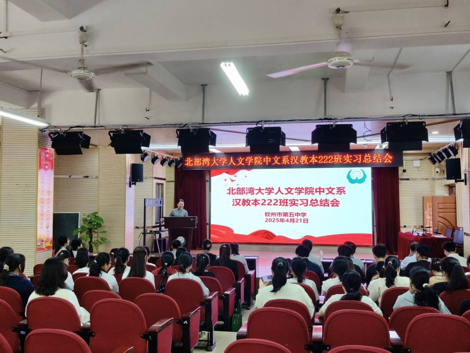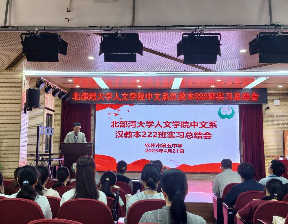 最后由我院院长钟其鹏教授与五中副校长谭宏轩作总结发言。钟其鹏院长首先对汉教本222班同学在五中两个月以来的实习表现给予了充分的肯定,并形象地将教师育人比作生产特殊“产品”的过程,强调实习生首先要不断提高师德修养,落实立德树人根本任务;其次要加强学习与实践,不断丰富专业理论知识和增强教育教学能力;最后希望同学们要以这次总结会为契机,针对自身存在问题认真学习,加强教师技能实训,积极参加学院组织开展的教学技能大赛、中华经典诵写讲大赛等学科竞赛,增强教育教学能力。谭宏轩副校长赞扬了实习生带来的新活力,肯定实习对五中工作的促进作用。他鼓励同学们要认真学习,做一名合格的中学语文教师;同时表达了与北部湾大学在教师培训、教育科研等方面加强合作的希望。