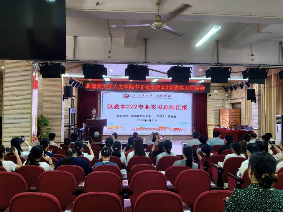 实习总结会第二阶段在五中报告厅进行。首先由实习学生代表苏晓敏进行总结汇报。她回顾了实习初期在北部湾大学的准备工作,以及在五中进行备课、授课、批改作业、组织班级活动和校园文化活动等实习过程与收获,同时也总结了存在问题,表明了今后努力的方向。她表示,同学们在实习所取得的巨大进步,都与老师们的悉心的指导和真诚的鼓励密不可分。