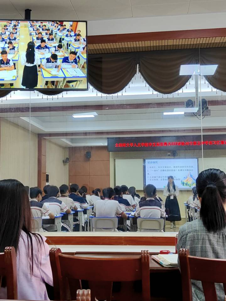 实习总结会第一阶段是由实习生代表区茵在五中录播室上公开课《一滴水经过丽江》。课堂上,区茵同学教态自然大方,教学重难点突出、板书简洁清晰,尽显从容自信,体现出实习生在经过教学实习后的长足进步,得到了五中老师的一致好评。这堂成功的公开课为总结交流会营造了良好的开场氛围。